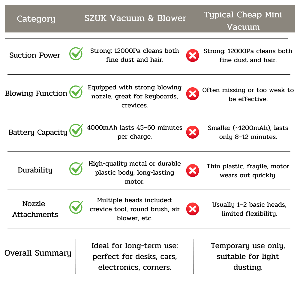 Absolutely love this little vacuum! The suction is surprisingly strong for such a compact device, and the blower function works great too. Super handy for quick car cleanups! -